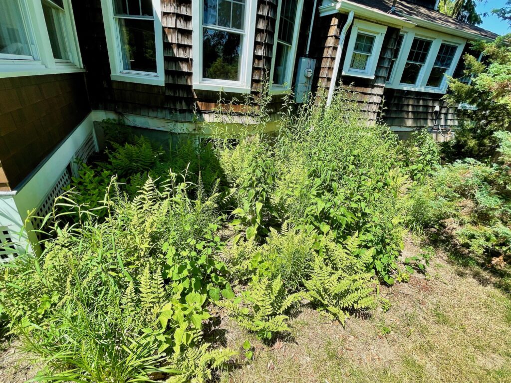 Before the planting could begin, we had much of the non-native trees and bushes removed from the property. That meant 150 feet of privet, 150 feet of yews overgrown to 15 feet high, and 3 sizable Norway Maples — most maples on Long Island are now non-native. All these legacy trees were planted in ignorance over the decades. Of the three, the yew is the only one that is not invasive. Still, since it is non native, it is pretty much ecologically useless. It will be at best a poor food source for local insects and local wildlife generally. In a world where space is precious, we can’t afford such a wasted opportunities to build native habitat.