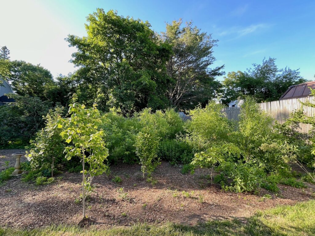 So we took up the challenge of transforming one yard to demonstrate to others the many benefits of native plantings. They become habitat for local wildlife, something non-native or invasive plants barely do if at all. If you are not fertilizing (natives evolved to thrive on what is here), using pesticides (don’t mess with the biome), or watering. Other than for establishing a new plant, natives should never require water, barring, say, catastrophic drought.